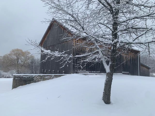 The barn, on the other hand, has a problem in winter that can make entry (and exit) nearly impossible, at least for humans. I refer here to the lower barn. Our barn is even older than the house, built by the first white man to own the land after the state of New York took it from the native Haudenosaunee. It’s large enough to have an upper floor where my husband works in his shop and where we store things, and a lower floor that, at one time, housed cows, horses, and pigs—there’s still a slurry culvert in the floor. This lower floor now has no animals, unless you count the myriad birds, snakes, squirrels, mink, possums, groundhogs, and the occasional visiting barn cat. Instead, it holds trash and recycling bins, boats, and heavy equipment like the tractor we use in winter to clear snow from the driveway. Unfortunately, the huge sliding barn doors collect moisture, then swell and expand when temperatures plummet, at which point they become immovable. No tractor gets out to clear the snow, and trash has to be hauled twice as far out the opposite side of the barn and down the long driveway.