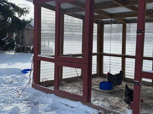 And the poor chickens! This year, the snow is so high, I had to shovel a path around the chicken run so the chickens could get into their yard. (Not that they want to run around much in subzero weather, but I thought I should offer them the option.) Brave Laverne, our one Leghorn, was the only chicken to make use of the shoveled path.