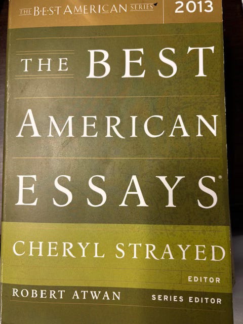 After I discovered my blunder, I got to thinking that there’ve been a few Best American Essay anthologies over the years that I never read, so I went straight to Thrift Books online and ordered some of them. My favorite so far is 2013, edited by Cheryl Strayed. In the Introduction, Strayed writes, “When I teach writing I tell my students that the invisible, unwritten last line of every essay should be “and nothing was ever the same again.” I’ve never taken a class with Strayed, so I don’t know what kind of teacher she is, but this seems like excellent advice. I’ve known for a long time that she’s a wonderful writer. Now I know she’s a hell of an editor who knows a great essay when she sees one. Each of the essays in this volume meets her criteria, and another as well: at the end of each essay, we, the readers, are never the same again. These are stories so mesmerizing, so beautifully told, they enter you, and then they stay. Take, for example, the very first essay, “Free Rent at the Totalitarian Hotel” by Poe Ballantine, first published in The Sun. The essay, just sixteen pages, is peopled by the most exquisitely drawn characters, each of whom could be the subject of their own book—and we kind of wish they were. There’s a lot going on here with the struggles and inner life of the speaker, the jobs and love lives of the various characters, and even the precipitous fall of the stock market. But, like a juggler whose flying objects all end up in his hands as he takes a final bow, Ballantine brings them all together in a satisfying final paragraph that’s brilliant and self-deprecating, and gives us the thrill of Strayed’s and nothing was ever the same again. I wanted to rise to my feet and shout Bravo!
